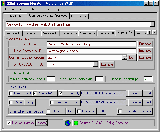 32bit Service Monitor可以用監視你的Web, Email, FTP等網路服務,在很短時間就可以