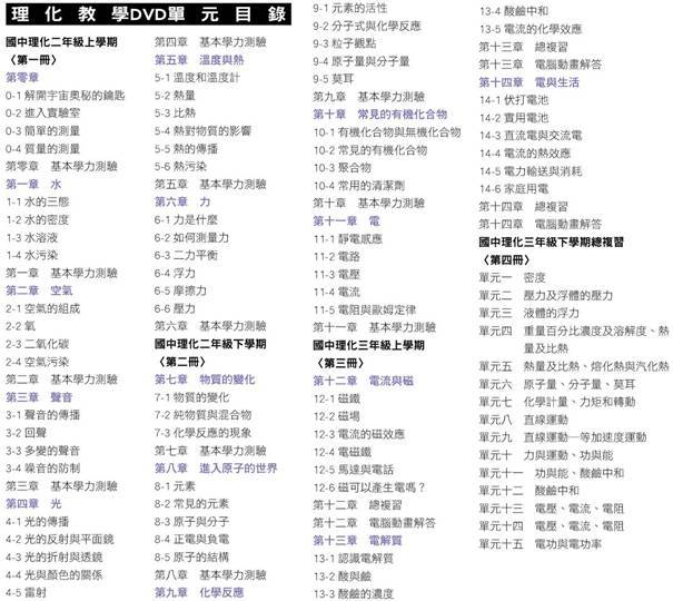 2013年7月 聯考必勝 劉國興老師 國中理化高分必備 第四冊總復習(三下) 繁體中文教學合輯版(DVD3片裝) -=-=-=-=-=-=-=-=-=-=-=-=-=-=-=-=-=-=-=-=-=-=-=-=-=-=-=-=-=-=-=-=-=-=-=-= 軟體名稱:2013年7月 聯考必勝 劉國興老師 國中理化高分必備 第四冊總復習(三下) 繁體中文教學合輯版(DVD3片裝) 語系版本:繁英多國語言字幕版 光碟片數:3片裝 破解說明: 系統支援:Windows 7/XP/Vista/DVD 播放機 軟體類型:命題題庫補習班國中高中研究所各科教學 硬體需求:PC,DVD 播放機 更新日期:2013-07-25 官方網站: 中文網站: 軟體簡介: 銷售價格:$540元 -=-=-=-=-=-=-=-=-=-=-=-=-=-=-=-=-=-=-=-=-=-=-=-=-=-=-=-=-=-=-=-=-=-=-=-=     軟體簡介: 國三下學期總複習(第四冊)<9年級下學期> 第一片DVD內容 第一卷 密度 第二卷 壓力及液體的壓力 第三卷 液體的浮力 第四卷 重量百分濃度及溶解度熱量及比熱 第五卷 熱量及比熱 熔化熱與氣化熱 共約5個小時課程 第二片DVD內容 第六卷 原子量、分子量、莫耳 第七卷 化學計量 力矩和轉動 第八卷 直線運動 第九卷 直線運動--等加速運動 第十卷 力與運動 共約5個小時課程 第三片DVD內容 第十一卷 功與能,酸鹼中和 第十二卷 酸鹼中和 第十三卷 電壓,電流,電阻 第十四卷 電壓,電流,電阻 第十五卷 電功與電功率 共約5個小時課程 共3片DVD影音光碟 -=-=-=-=-=-=-=-=-=-=-=-=-=-=-=-=-=-=-=-=-=-=-=-=-=-=-=-=-=-=-=-=-=-=-=-=